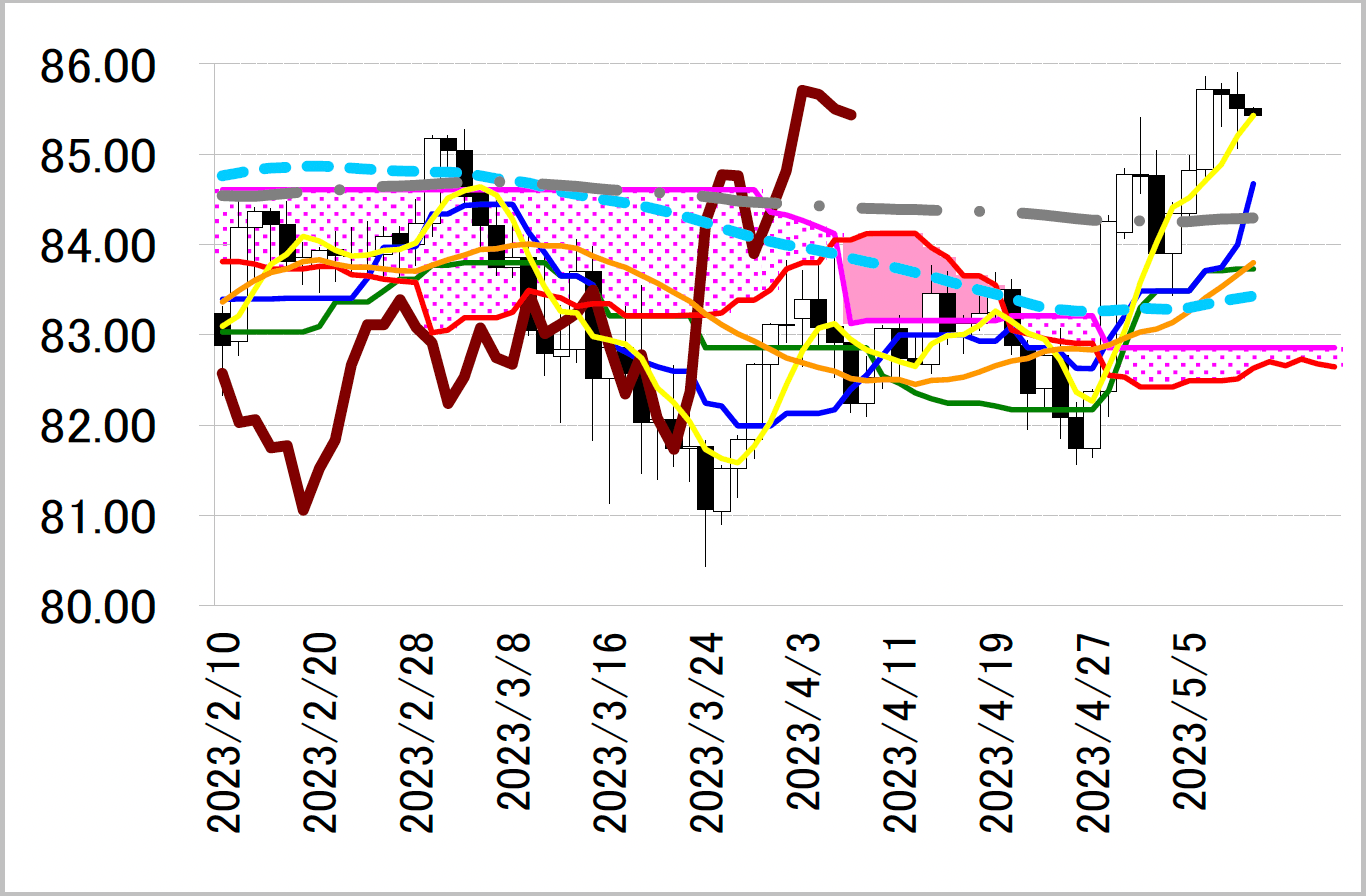 陰線引け。転換線は基準線を上回り、遅行スパンは実線を上回り、雲の上で引けていることで三役好転の強い買いシグナルが点灯中。しかし、3 手連続陽線の後の抱き線で反落して転換線を下回って引けており続落の可能性が示唆されている。本日は、転換線を抵抗に戻り売りスタンスで臨み、同線を上抜けた場合は手仕舞い。