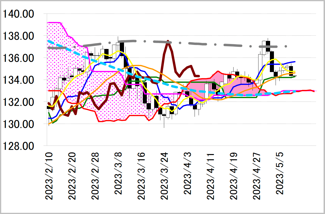 サポート2 133.00(日足一目均衡表・雲の上限)
