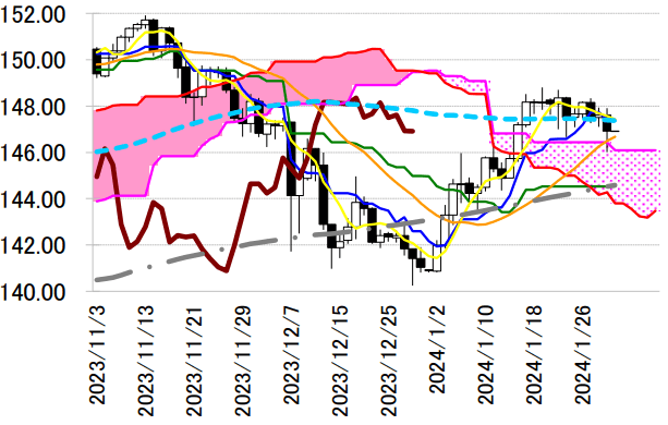 本日は転換線 147.36 円を念頭に置き、1 月 31 日の高値を