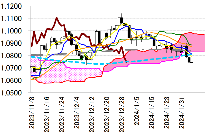 ユーロドルは続落。終値は1.0743ドルと前営業日NY終値(1.0788ドル)と比べて0.0045ドル程度の ユーロ安水準となった。米経済指標の上振れをきっかけに米早期利下げ観測が後退するとドル全面高の展 開となった。米長期金利の指標となる米10年債利回りが4.17%まで急騰したこともユーロ売り・ドル買 いを促し、一時1.0723ドルと昨年11月14日以来の安値を付けた。