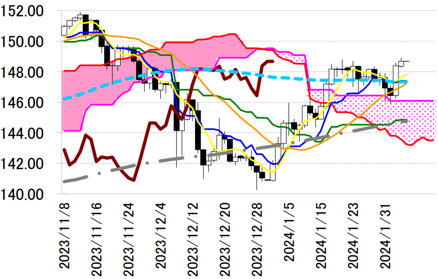 昨日のドル円は、パウエルFRB議長の発言「3月以降まで利下げに踏み切るのを待つ公算が大きい」を 受けて、1月19日の高値148.80円を上回り148.89円まで上昇した。