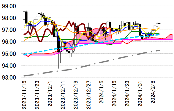 97.89 円を試す展開。そこからは昨年 12 月・11 月の高値圏