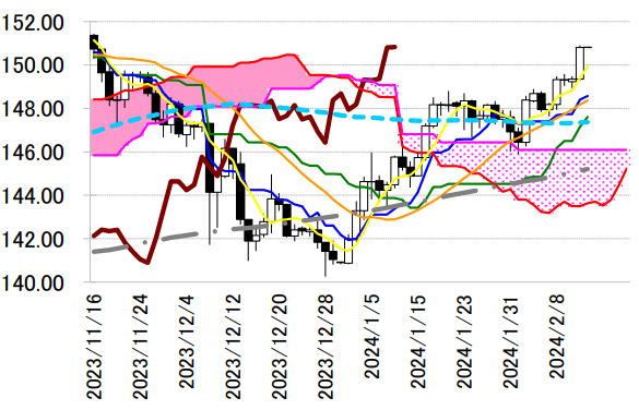 大陽線引け。一時 150.89 円と昨年 11 月 16 日、約 2 カ月