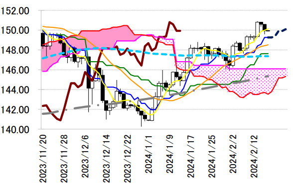 見込みの一目均衡表・転換線 149.26 円が支えになるとみる。