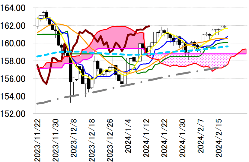 本日の東京外国為替市場のドル円は、ニューヨーク市場が休場のため動きづらい展開の中、日経平均株 価の史上最高値の更新期待から底堅い展開が予想される。 先週16日の日経平均株価は38865.06円まで上昇し、1989年12月29日のザラバの高値38957.44円に 92.38円、終値38915.87円に50.81円まで迫った。