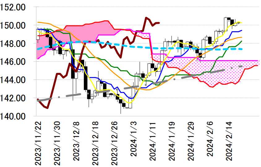 ドル円が現状の上昇トレンドで151円台に乗せた場合、本邦通貨当局からの円安抑制措置には警戒しておきたい。