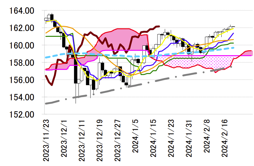 先週16日の日経平均株価は38865.06円まで上昇し、1989年12月31日のザラバの高値38957.44円に 92.38円、終値38915.87円に50.81円まで迫っており、本日のドル円は、日経平均株価の史上最高値の 更新期待から底堅い展開が予想される。