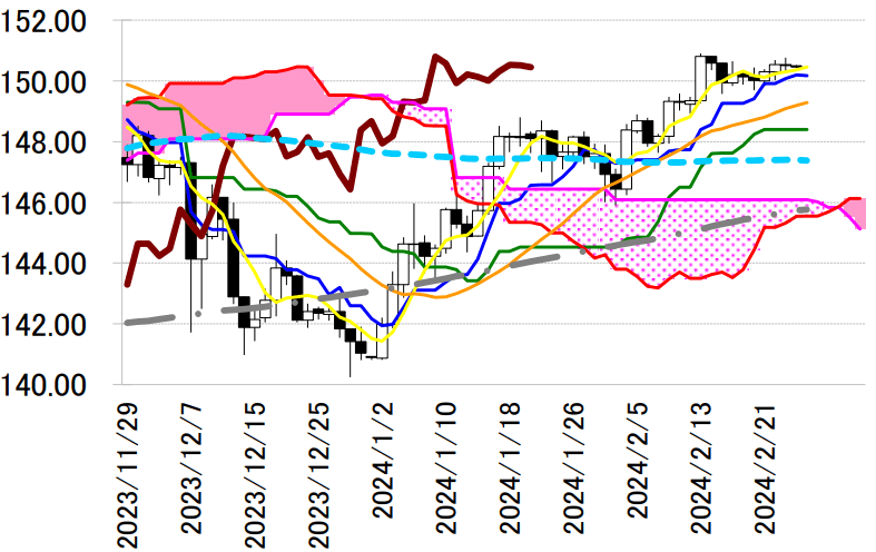 本日は転換線 150.20 円を念頭に置き、20 日の安値を支持