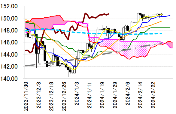 本日は転換線 150.27 円を念頭に置き、27 日の安値を支持