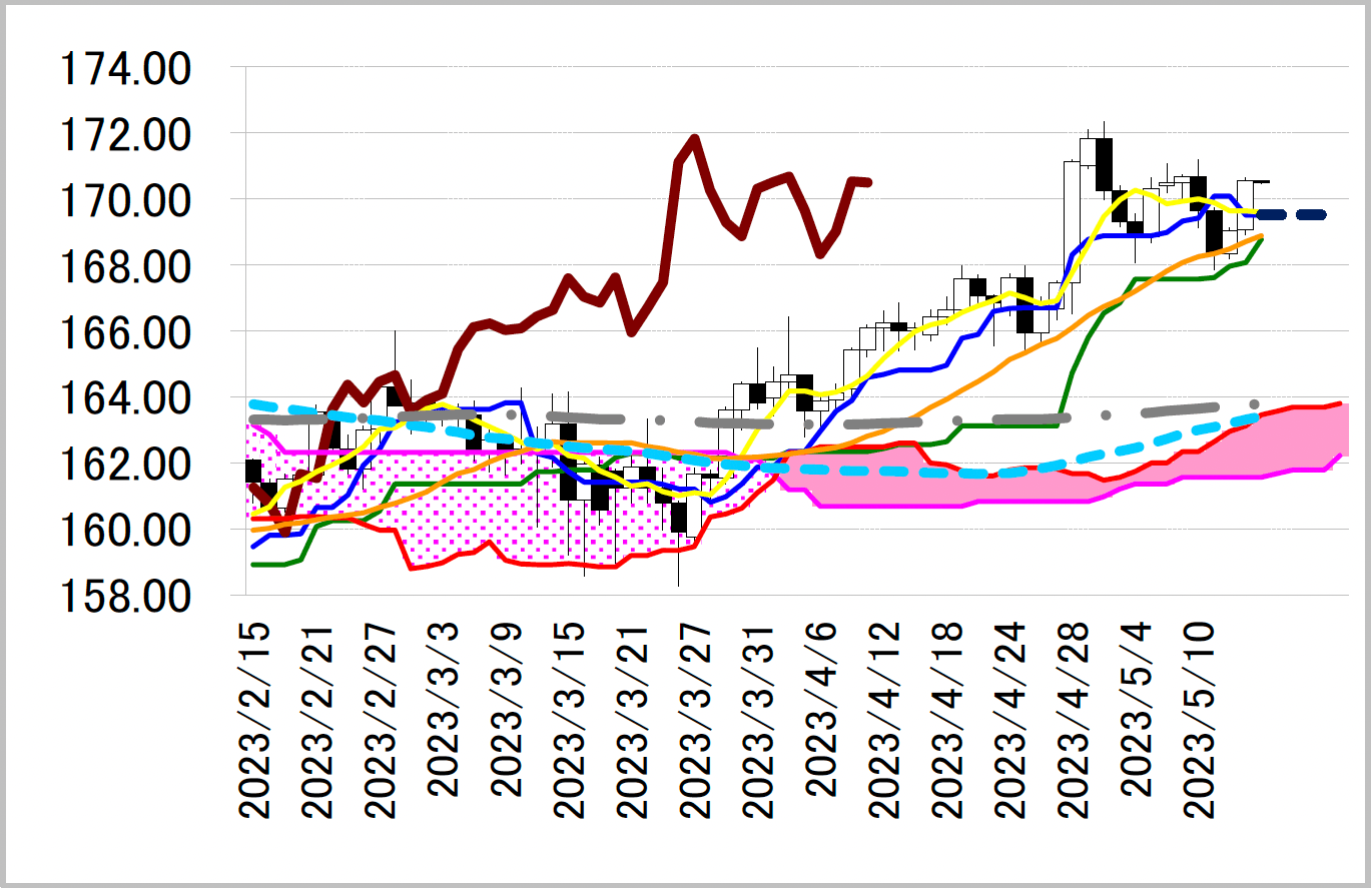 陽線引け。目先の抵抗だった一目均衡表・転換線を上抜け、170 円台に乗せた。転換線はしばらく現水準169.51 円で横ばい推移となり、下押し局面での支えとなりそう。同線や169円台で上昇中の5 日移動平均線付近の底堅さを背景に、10 日高値171.18 円などの抵抗をこなしながら上値を試す展開が想定できる。