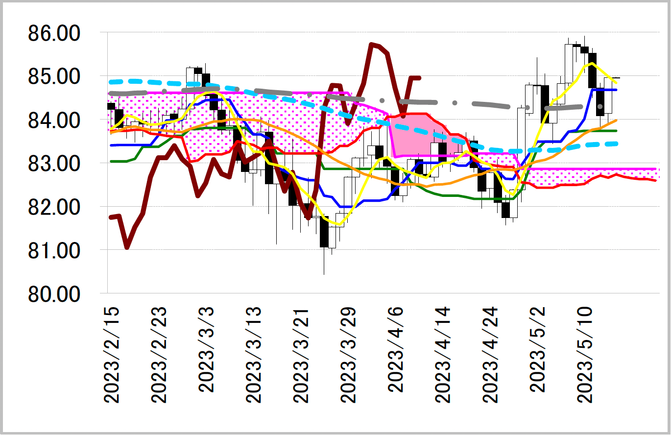 陽線引け。一目均衡表・転換線84.67 円を上回り、85 円回復をうかがう様相となっている。昨日は、84.98 円前後に位置していた5 日移動平均線を上抜けなかったが、本日朝方は84.84 円へ低下した同線を上回って推移する状態となっている。目先の抵抗をどうにかこなした格好で、85 円台に乗せる展開が期待できる。