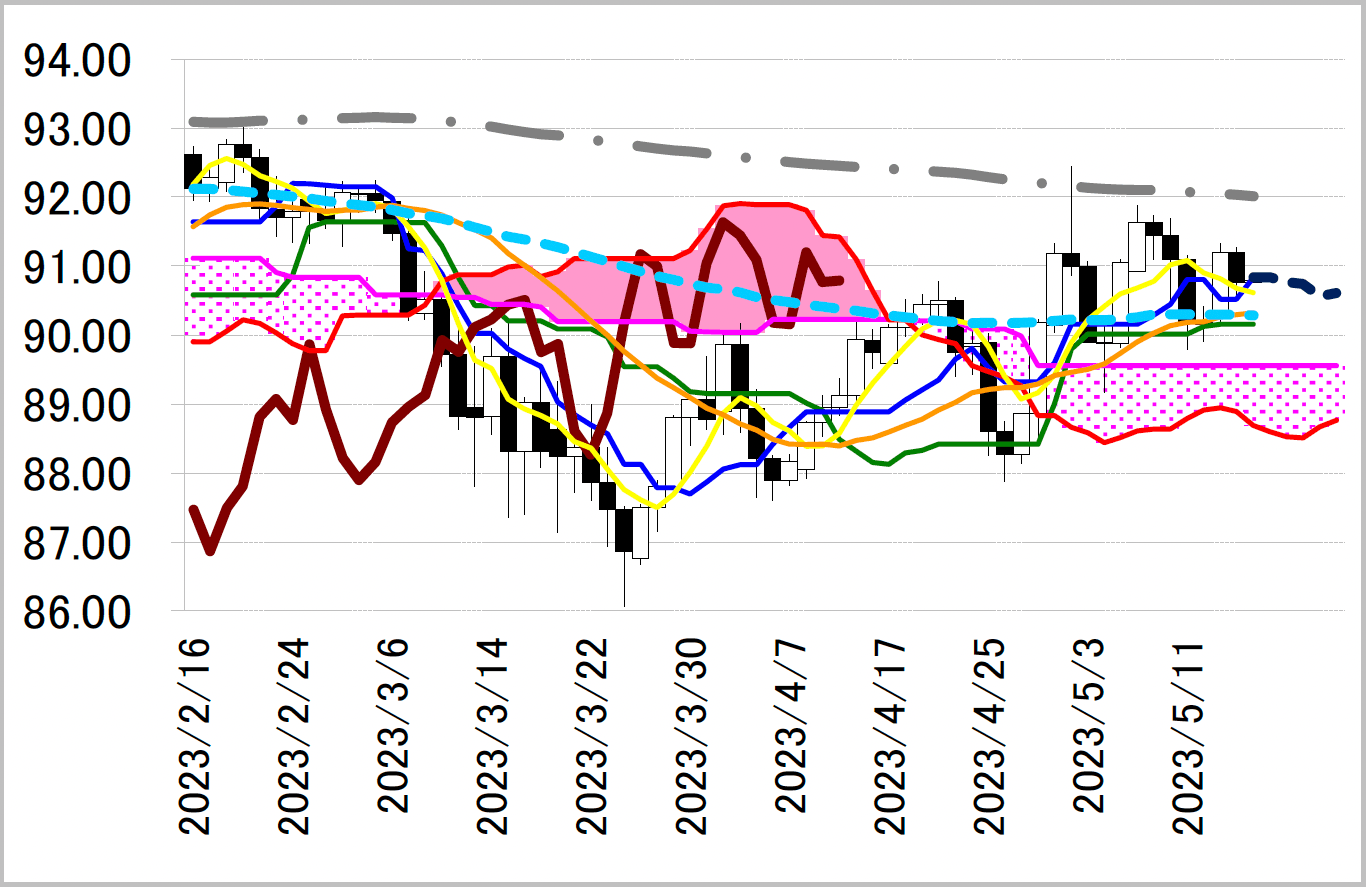 下影陰線引け。90.57 円へ下押し先行後、91 円台へ戻したものの伸び悩み、結局90 円台へ押し返されてNY を引けている。一目均衡表・転換線90.52 円が目先のサポートになった。しかし同線は本日90.84 円へ切り上がた後、現状からすればいったん低下へ転じる見込み。不安定な相場推移の示唆ともいえる。90.29 円前後で推移する90 日移動平均線や一目・基準線90.16 円をここからの目先的な支えとしつつも、11 日安値89.80 円や一目・雲の上限89.55 円といった水準まで下値を探るリスクも念頭に置いて臨むべきか。