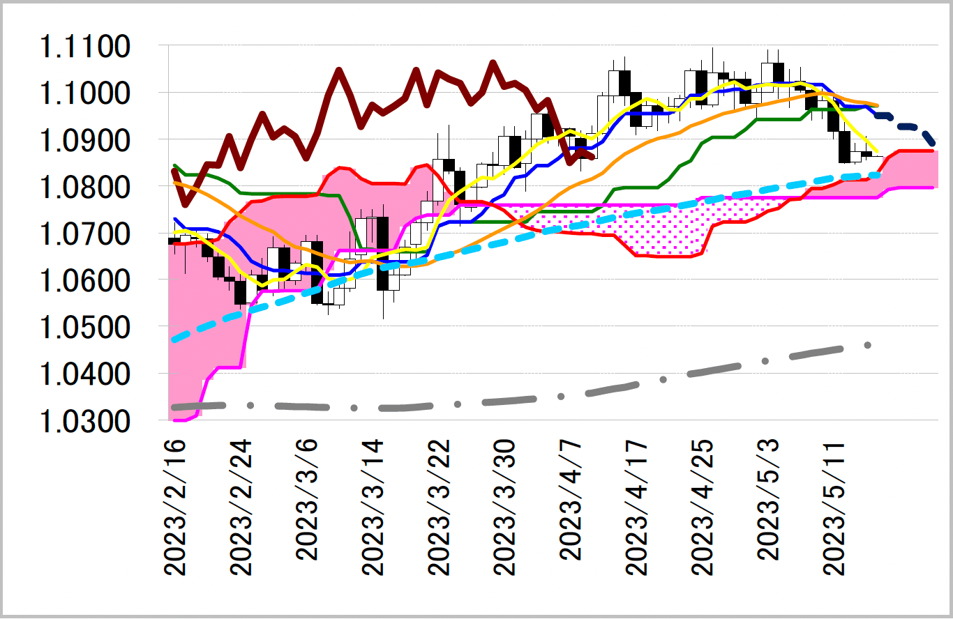 上影小陰線引け。1.09 ドル台では上値が重く、1.08 ドル台中心のさえない推移が続いた。一目均衡表・雲の上限1.0826 ドルや90 日移動平均線といった水準で底堅さを示すことができるか見定める状況が継続。雲付近から反発できても、低下傾向の一目・転換線1.0950 ドルや、基準線1.0971ドルが上値を抑えそうな状態も変わらない。
