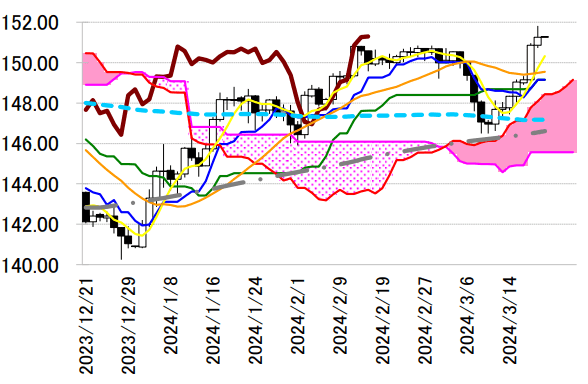 19日の日銀金融政策決定会合では、マイナス金利(▲0.10%)からゼロ金利へ引き上げられたものの、 「当面の間は緩和的な金融環境を維持する」と表明されたことで、ハト派的な利上げとなり、ドル円は 151.82円まで上昇して年初来高値を更新している。