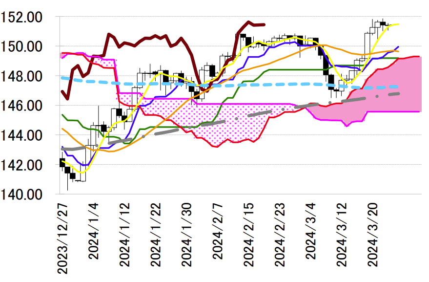 ただ、政府・日銀による為替介入への警戒感が根強い中、一本調子で上昇する展開にはならなかった。 22日の高値151.86円や2022年10月21日の高値151.95円、ノックアウトオプションが観測されている 152.00円などがレジスタンスとして意識された。
