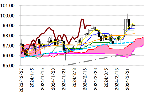 ほぼ寄引き同事線引け。前日高値を上抜けて 99 円前半で