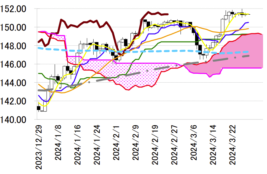 まま。下値は先週末以降に下げ止まっている 151 円を割り込