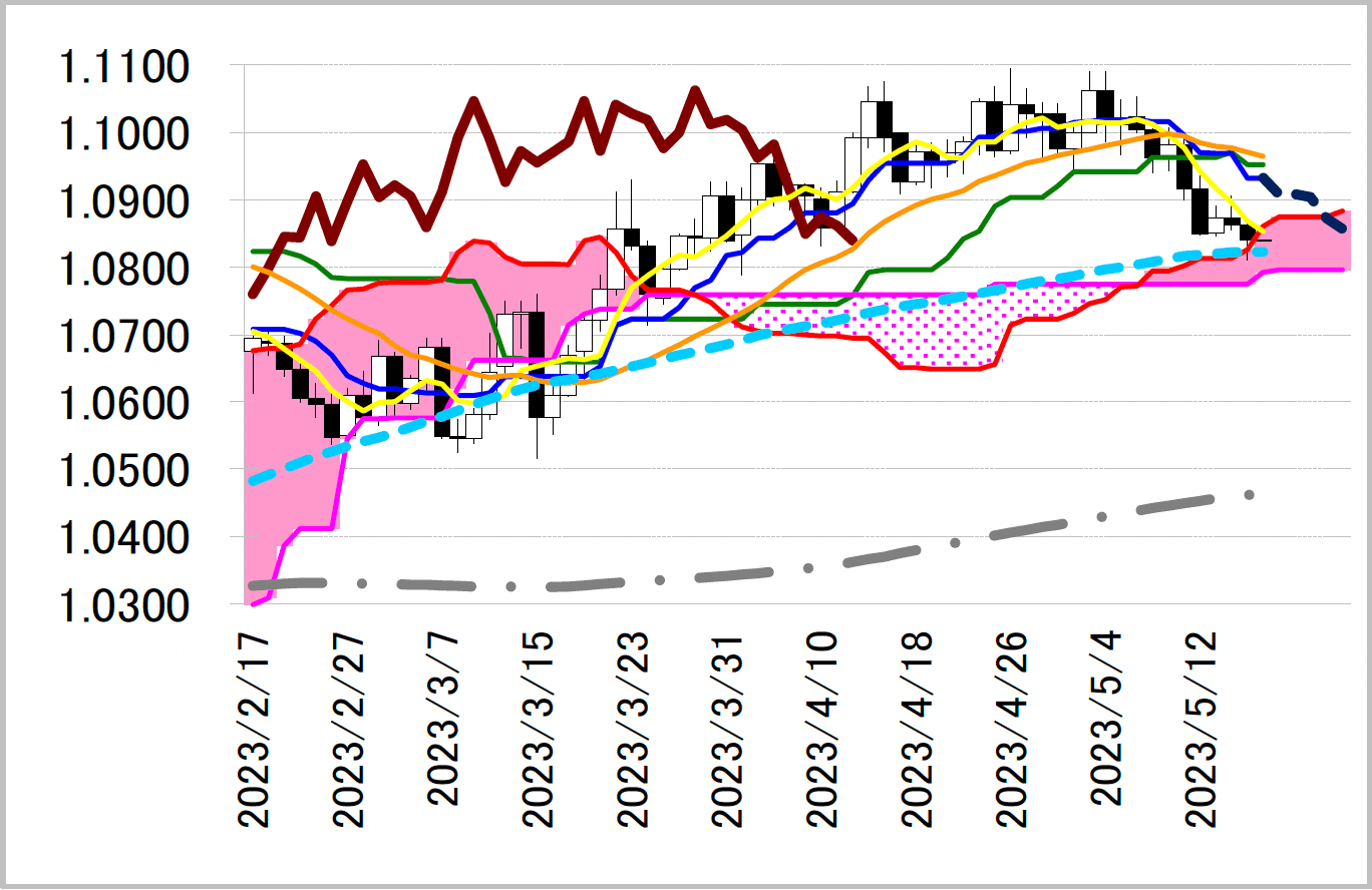 下影小陰線引け。一時1.0810 ドルと、4 月3 日以来の水準まで下振れた。本日1.0860 ドルへ低下した一目均衡表・雲の上限を下回る推移となっており重い動きが続きそう。昨日一時下回った90 日移動平均線も本日1.0822 ドル前後へ小幅に低下。90 日線の低下に沿うような弱い動きとなり、雲の下限1.0792 ドルを意識した展開となるか。