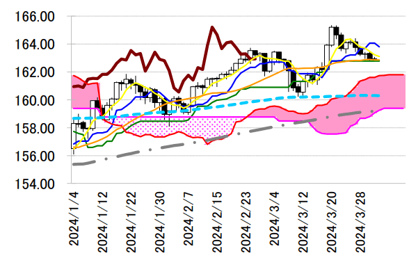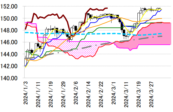 本日は転換線 151.12 円を念頭に置き、3 月 27 日の安値を