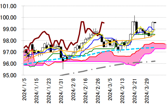 ただ、3月米ISM非製造業指数が51.4と予想の52.7を下回ったことが分かると失速した。一時は 4.4274%前後と昨年11月以来の高水準を付けた米10年債利回りが低下に転じたことも相場の重しとなり、 151.58円付近まで下押しした。政府・日銀による為替介入への警戒感が根強い中、3月27日に付けた34 年ぶりの高値151.97円やノックアウトオプションが観測されている152.00円もレジスタンスとして意識 された。なお、パウエル米連邦準備理事会(FRB)議長は講演で「雇用とインフレに関する最近の統計は 予想よりも強いが、全体像は大きく変わらない」としたうえで、「経済の力強さとインフレを巡るこれま での進展を踏まえると、今後発表されるデータに基づいて政策決定を行っていく時間がある」と述べ、利 下げを急がない考えを改めて強調した。