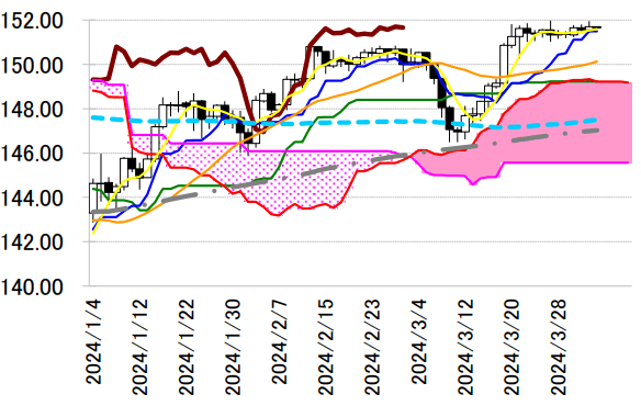 本日は転換線 151.50 円を念頭に置き、3 月 27 日の安値を
