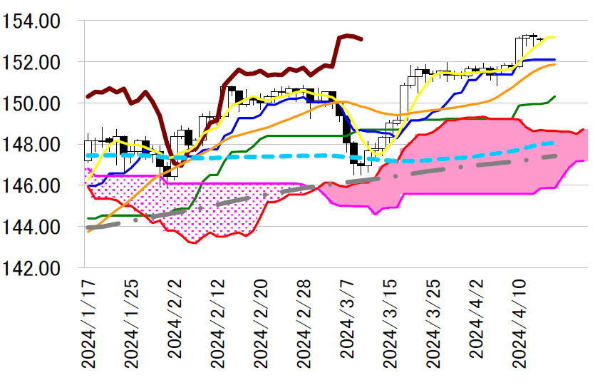 ドル円は、2022年秋の本邦通貨当局によるドル売り・円買い介入以来、152円が防戦ラインと見なされ てきた。しかし、今回153円台に上昇しても、円買い介入が実施されないことで、防戦ラインが155円付 近まで引き上げられているのではないか、との見方が広がっている。