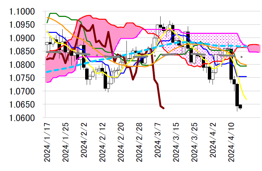 ユーロドルは3日続落。終値は1.0643ドルと前営業日NY終値(1.0726ドル)と比べて0.0083ドル程 度のユーロ安水準だった。中東の紛争拡大リスクの高まりを背景にリスク・オフのドル買いが入ると一時 1.0623ドルと昨年11月以来約5カ月ぶりの安値を付けた。米ミシガン大学が公表した4月米消費者調査 で、消費者態度指数(速報値)は予想を下回ったものの、同時に発表された消費者の期待インフレは予想 を上回った。昨日の欧州中央銀行(ECB)定例理事会をきっかけに、ECBの利下げ開始時期が近づいてい るとの見方が一段と強まる一方、米連邦準備理事会(FRB)による利下げ開始は想定より後にずれるとの 観測が高まっており、欧米の金利差拡大への思惑からユーロ売り・ドル買いが出た面もあった。