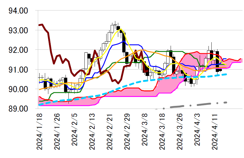 本日は雲の下限91.05円を念頭に置き、上昇中の転換線を
