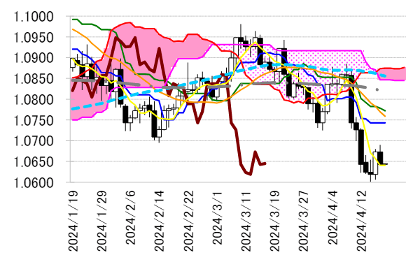 ユーロドルは反落。終値は1.0643ドルと前営業日NY終値(1.0673ドル)と比べて0.0030ドル程度の ユーロ安水準だった。欧州中央銀行(ECB)が6月にも利下げに動くとの見方が強まる一方、FRBによる 利下げ開始は想定より後にずれるとの観測が高まっており、欧米の金利差拡大への思惑からユーロ売り・ ドル買いが出やすかった。3時30分過ぎには一時1.0642ドルと日通し安値を更新した。