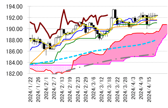小陽線引け。転換線は基準線を上回り、遅行スパンは実線