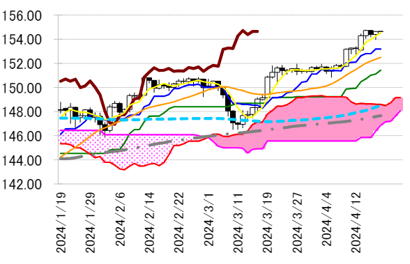 ワシントンで日米韓財務相会合、G7財務相・中央銀行総裁会議、G20財務相・中央銀行総裁会議が開催 されたが、ドル高是正の緊急性が乏しいとされたためドル円は154円台後半まで反発した。