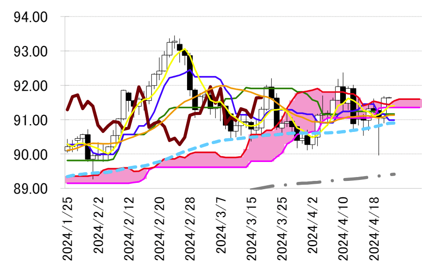 本日は転換線 90.99 円を念頭に置き、22 日の安値 90.89 円