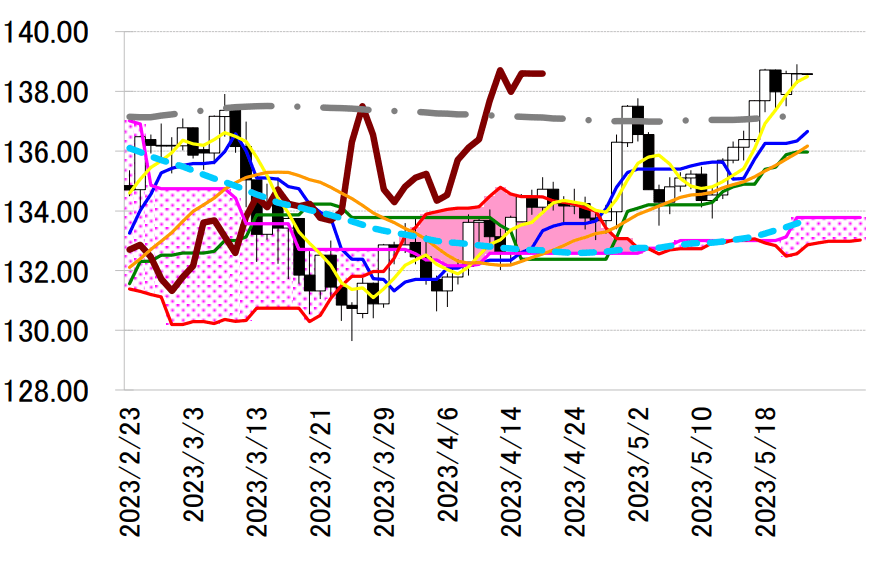 む場面もあった。しかし下げ渋り 138.91 円まで約半年ぶりの高値を更新した。ただ、足型は寄り引けの水準がほぼ重なる足型・十字線で、高値圏での気迷いを示唆。本日 138.49 円前後へ切り上がった 5 日線を割り込んで、相応の調整が進む場面も想定しておきたい。