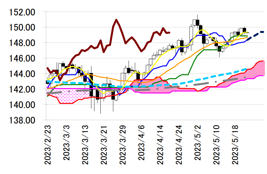 陰線引け。一時 150.06 円と 3 日以来の 150 円回復となった。だが、頭打ちとなり 149 円付近へ反落している。ここ最近の下支えとなっていた一目均衡表・基準線 148.87 円前後の攻防となりそう。ある程度の底堅さを維持しても、19 日安値 148.72 円ぐらいまでの下押しはありそうだ。