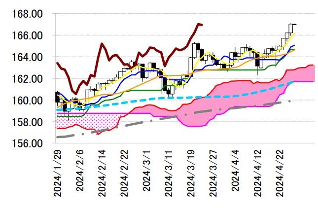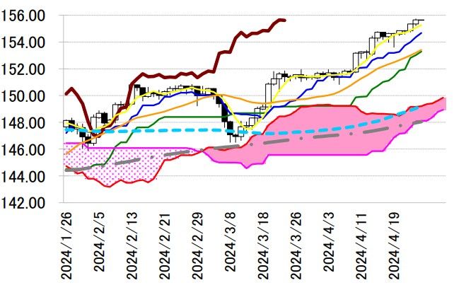 ■2024 年 4 月 26 日 ・IMM ネット円売り持ち高:165619 枚(※4/16 時点) ・ボリンジャー・バンド+2σ:156.55 円 ・FF 金利誘導目標:5.25-50%