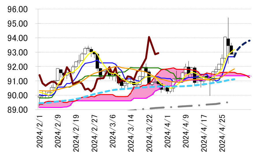 想される。93 円台への上昇が見込まれる転換線の動きに沿っ