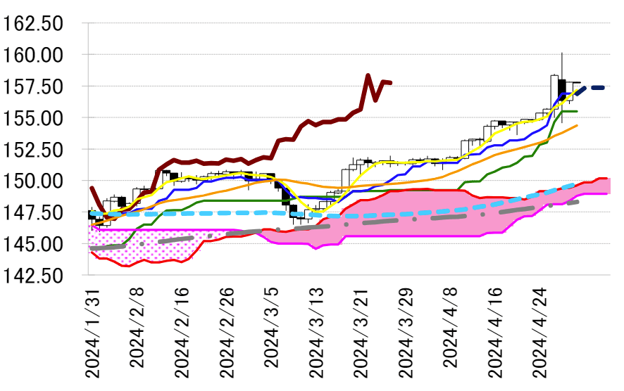 る 159 円付近を目先のめどに、4 月 29 日につけた 34 年ぶり
