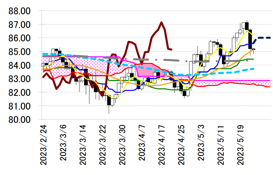 下影大陰線引け。一目均衡表・転換線を下抜け、84.97 円前後に位置していた 21 日移動平均線も一時割り込む大幅安となった。大きく下落した反動の戻りがいったん入る可能性もある。85.14 円前後へ切り上がった 21 日線を下回る水準では底堅さを示しそうであり、85.61 円へ上昇した転換線の動きも戻す可能性の示唆といえる。