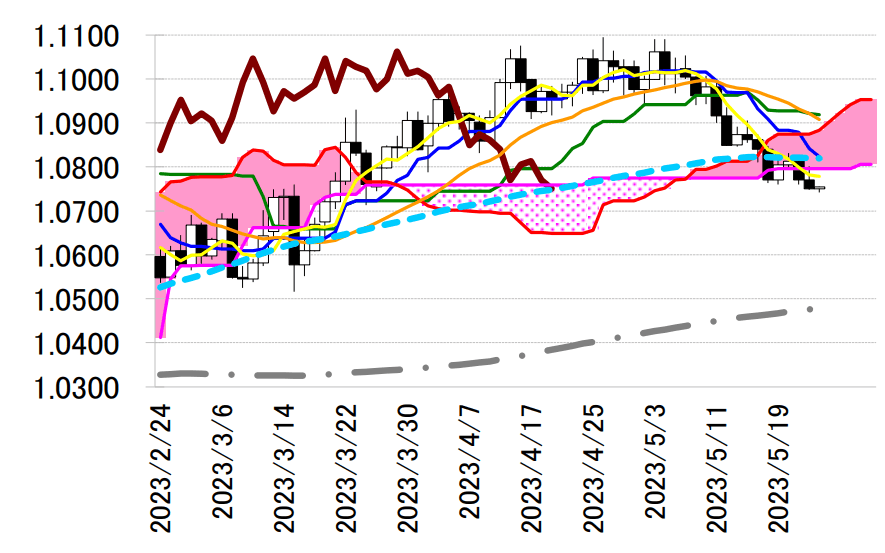 上影小陰線引け。一目均衡表・雲の下限 1.0796 ドルを一時上回るも戻りが鈍く、1.0740 ドル台まで下値を探った。雲の下限付近が引き続き重そうであるほか、1.0778 ドル前後へ低下してきた 5 日移動平均線近辺での動きも重くなりそう。3 月 24 日安値 1.0713 ドルや同 20 日安値 1.0631 ドルなどを意識した重い推移が継続しそうだ。