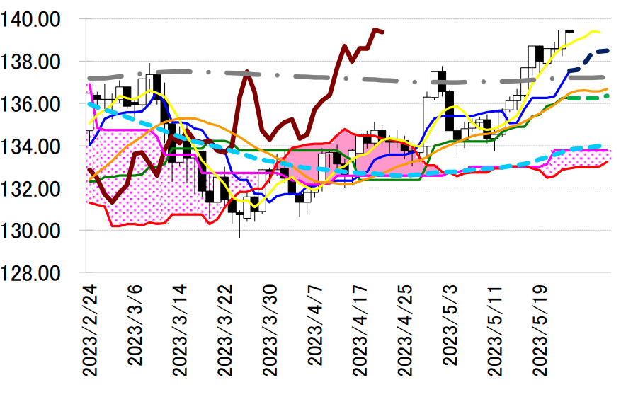 下影陽線引け。23 日に気迷いを示唆する足型・十字線を形成した後、昨日は高値圏で調整のじり安が 138.23 円まで小幅に先行した。138 円台で上昇中の 5 日移動平均線をいったん下回ったものの下げ渋り、一時 139.48 円と昨年 11 月 30 日以来、約半年の高値を更新。昨年 10 月から今年 1 月までの下落に対する半値戻し 139.59 円付近で戻りが鈍る可能性はあるが、再び調整を挟んでも、本日 138.80 円付近へ切り上がる 5 日線近辺では底堅さを示すとみる。