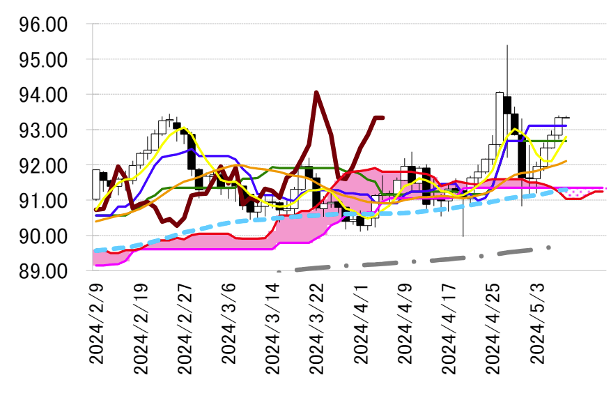本日は転換線 93.11 円を念頭に置き、基準線を支持に押し
