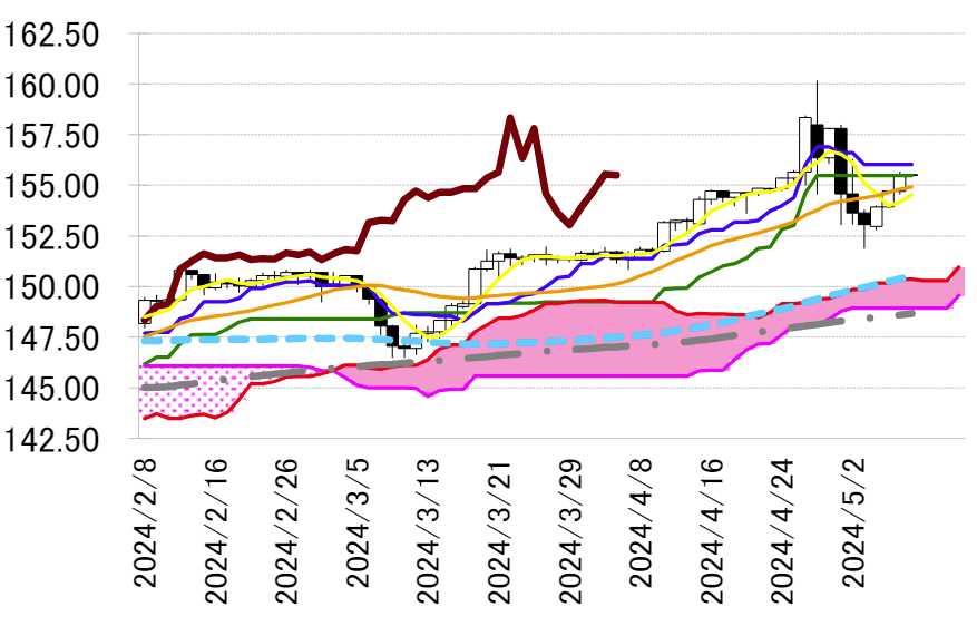 本日の注目水準としては、4月29日の年初来高値160.17円から3日の安値151.86円までの下落局面 からの半値戻しである156.02円。一目均衡表・転換線でもあり、重要なレジスタンスとして意識されて いる。