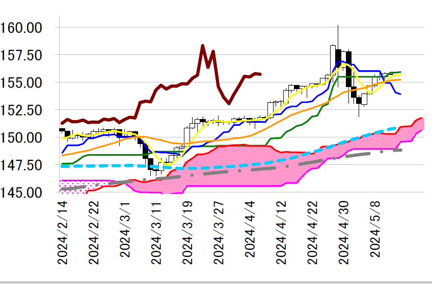 週末に155 円割れまで大きく水準を切り下げた日足一目・転