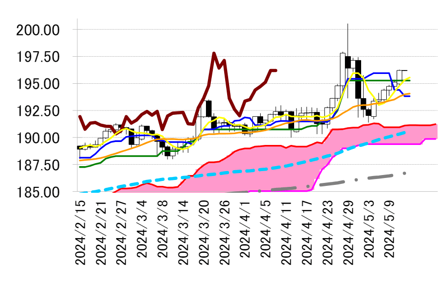陽線引け。195 円前半の日足一目・基準線を上抜けると上