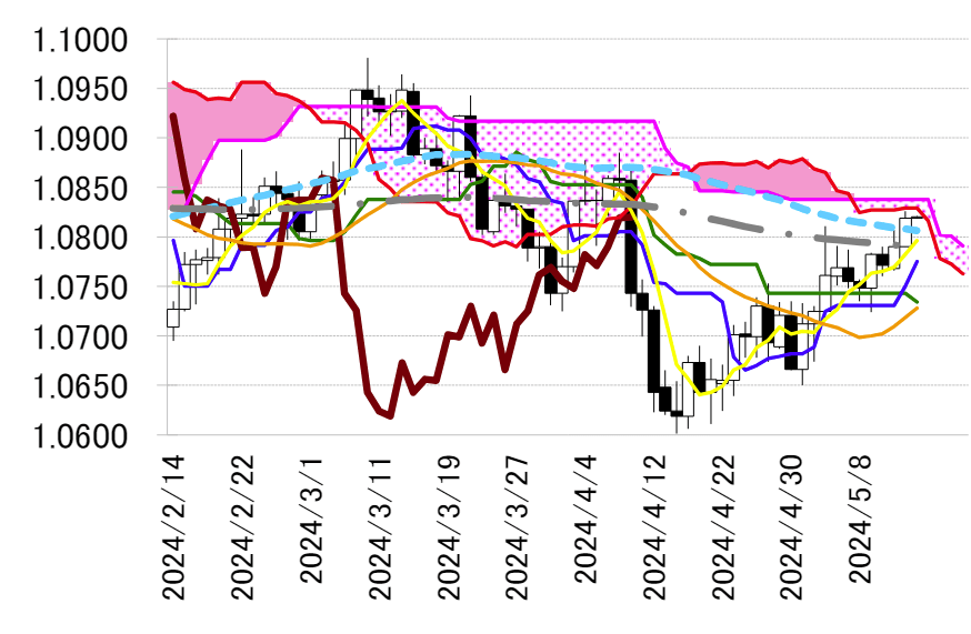 ドル前半で日足一目・雲に迫った。一目・転換線は 1.0770