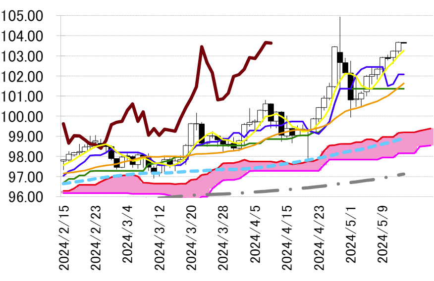 4 月 29 日以来の 104 円台回復が目前であり、大台に乗せてく