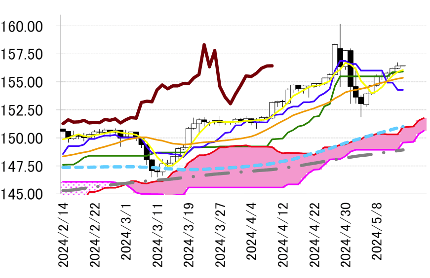 テクニカル面では、13日に直近高安(4月29日高値160.17円-5月3日安値151.86円)の半値戻し(156.02 円)を達成したことで、直近高安の61.8%戻し(157.00円)が視野に入っている状況である。