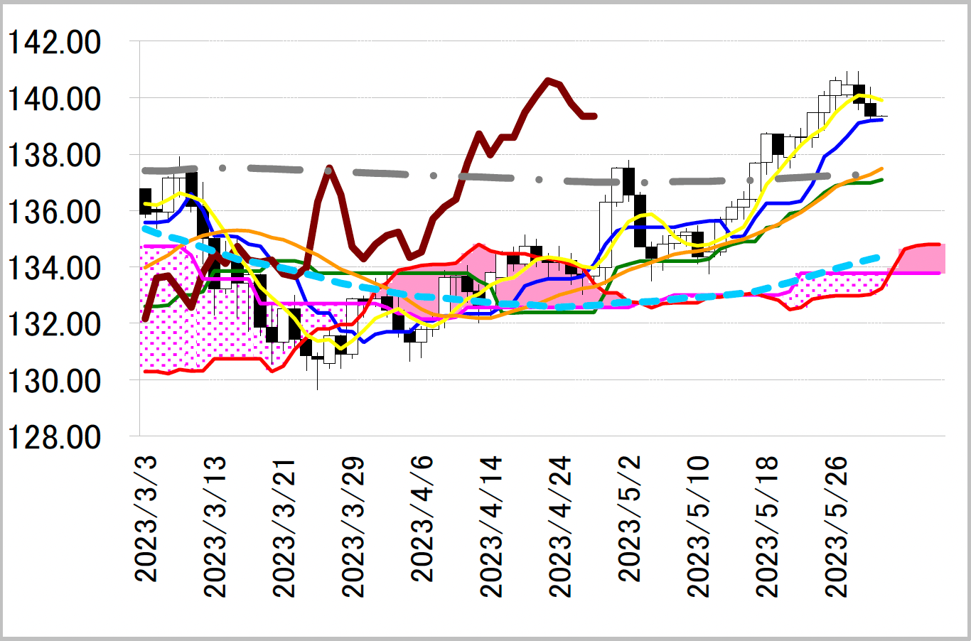 陰線引け。転換線は基準線を上回り、遅行スパンは実線を上回り、雲の上で引けていることで、三役好転の強い買いシグナルが点灯中。2手連続陰線で下落したものの転換線を上回って引けており反発の可能性が示唆されている。本日は、転換線139.22円を念頭に置き、5月25日の安値