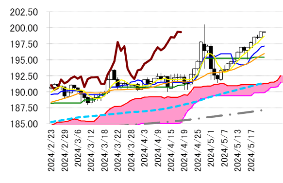 う上向きの流れが続いている。同線は本日 198.70 円前後へ