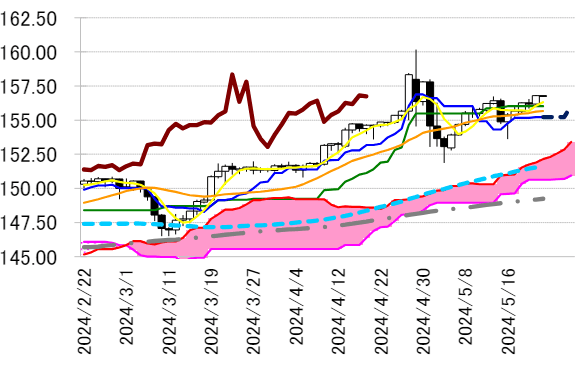 レジスタンス 1 157.25(5/21 下落幅の倍返し)